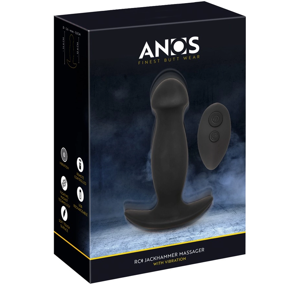 Vibro-buttplug RC JackHammer Massager van ANOS met een innovatieve Floating Magnet Technology die de plug op een intense manier laat schudden, pulseren en stuwen. De intense klopimpulsen in de uitpuilende schacht zorgen voor een uiterst aangename stimulatie van het anale gebied en stimuleren ook direct de prostaat. Trillingen en pulsaties kunnen ook zeer intens worden gevoeld in het perineum bij het dragen van de plug.